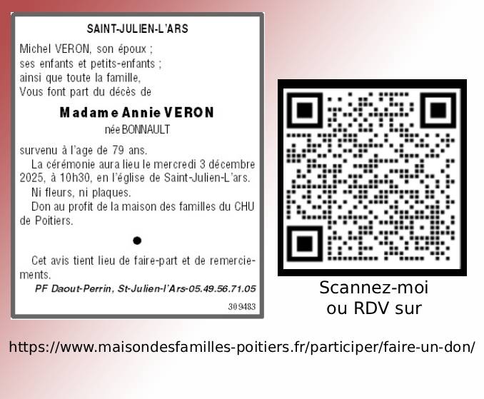 C’est avec une grande tristesse que nous vous annonçons le décès d’Annie VERON survenu le jeudi 27 novembre 2025 à Poitiers.