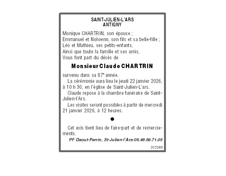 C’est avec une grande tristesse que nous vous annonçons le décès de Claude CHARTRIN survenu le samedi 17 janvier 2026 à Saint-Julien-L'Ars.