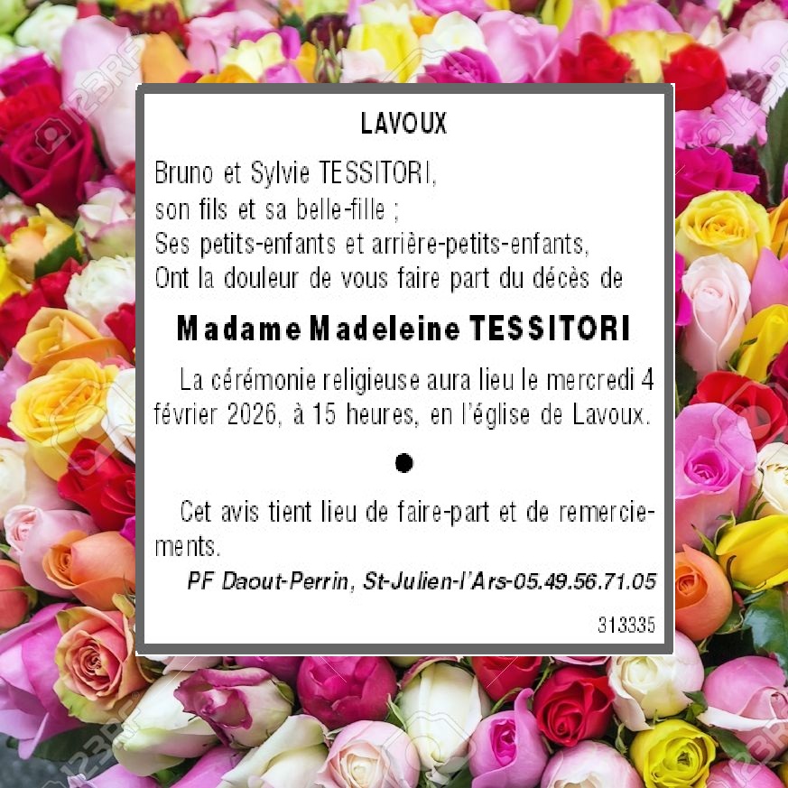 C’est avec une grande tristesse que nous vous annonçons le décès de Madeleine TESSITORI survenu le jeudi 29 janvier 2026 à Poitiers.